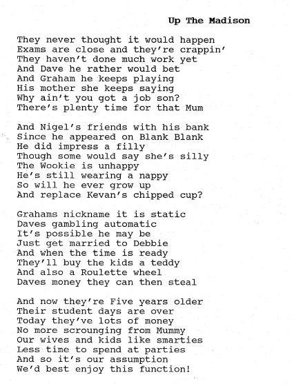 These lyrics were penned in March 1985 in Canning Street, Newcastle by Garry to celebrate the birthdays of Nigel, Graham and Dave Nunn with a party at Madisons nightclub. Apologies to Squeeze for stealing the tune.